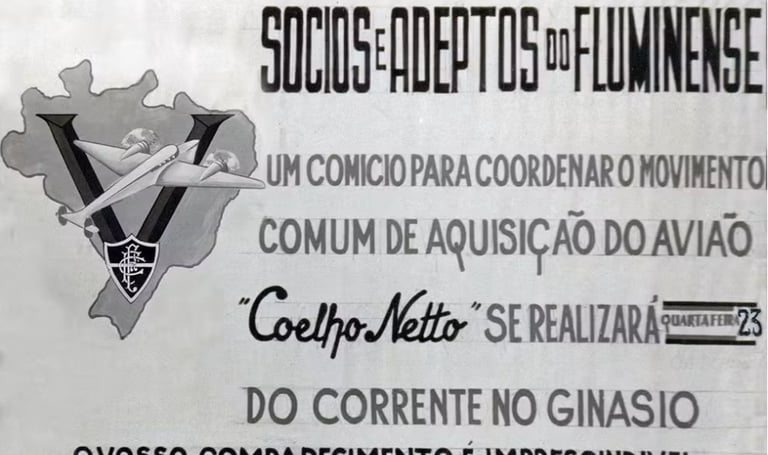 📍 O avião foi batizado “Coelho Netto”, em homenagem póstuma ao escritor, patrono e sócio do clube.